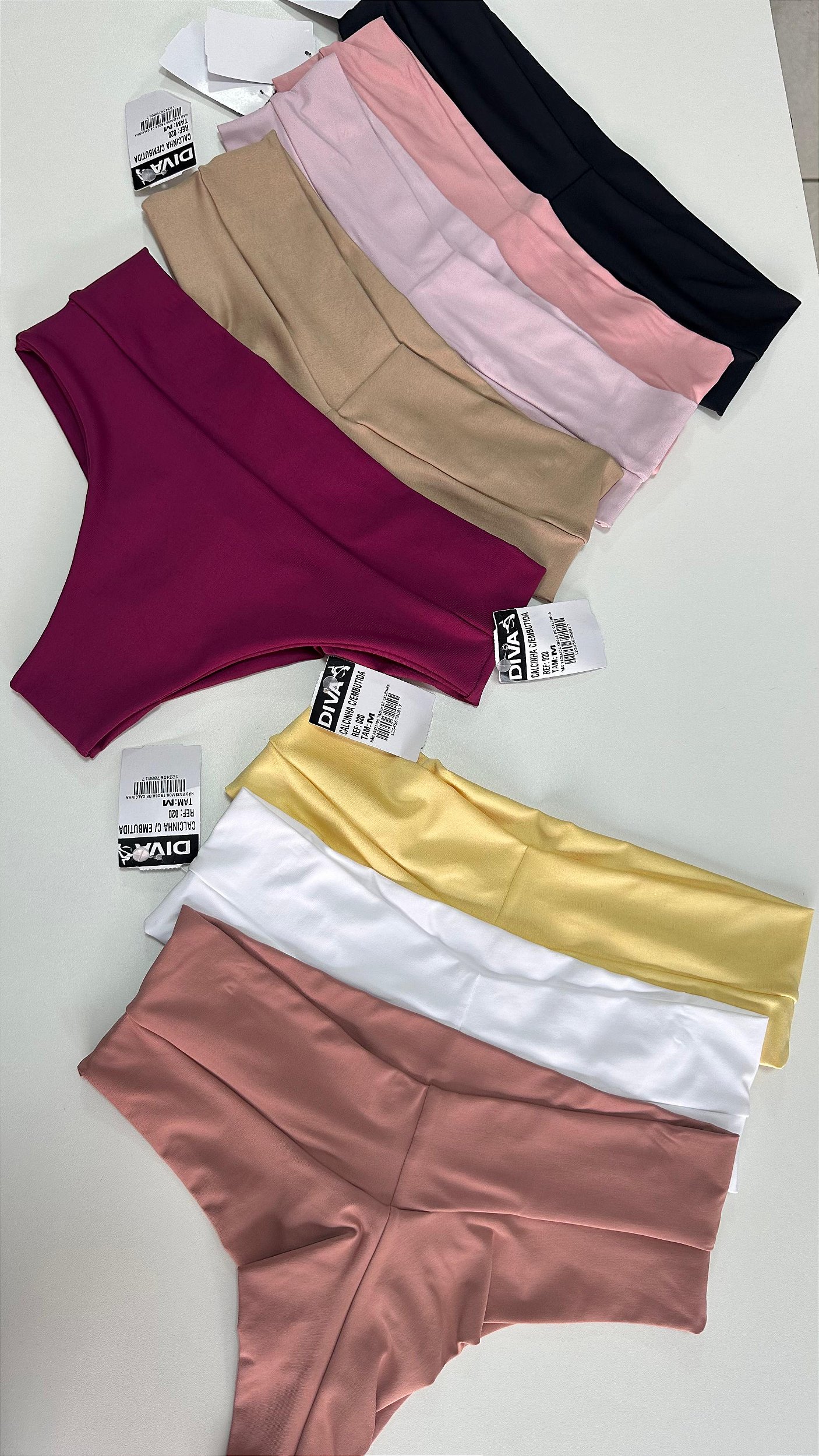 Kit com 10 und. Calcinha Costura Embutida, uma peça toda dupla, fio duplo, tecido de poliamida. NÃO TEM COMPRESSÃO. Oferece um perfeito ajuste ao corpo sem perder a elegância. Ideal Para o uso no dia a dia, pois sendo muito confortável, ela não incomoda nem machuca. Simplesmente uma peça indispensável para o seu guarda roupas.
